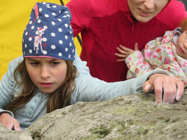 Psi Nos to kilka skałek między Kusiętami, a Srockiem, położonych na wzgórzu pośrodku liściastego, jurajskiego lasu. Bez GPS'a nie ma szans tam trafić. Z nawigacją też nie jest łatwo, ale dzięki temu nikogo się tam nie spodziewaliśmy, bo wypaśne baldy znajdują się kilometr dalej i to tam kierują swe kroki wymiatacze boulderingu. Ten rejon został przez odkrywców zaklasyfikowany jako miejsce dla początkujących czyli w sam raz dla naszej dzieciarni (i dla nas). Na miejscu czekało dwanaście przystawek ulokowanych na dwóch niewysokich kamieniach. Na pierwszym dzieciakom wspinanie nie szło (zbyt duże odległości między półkami skalnymi), natomiast na mniejszym szalały, bo w głazie pełno było małych dziurek, gdzie bez kłopotu wkładały paluchy. Róża jakby od niechcenia pokonywała bald za baldem, Franek niewiele jej ustępował - ambicja go niosła, a Łusia z gracją spadała na materac. Gdy się nie wspinały, skakały na crashpady, spotowały się nawzajem, robiły filmiki aparatem. Na tyle im się to podobało, że na cztery godziny zapomniały o istnieniu komórek.